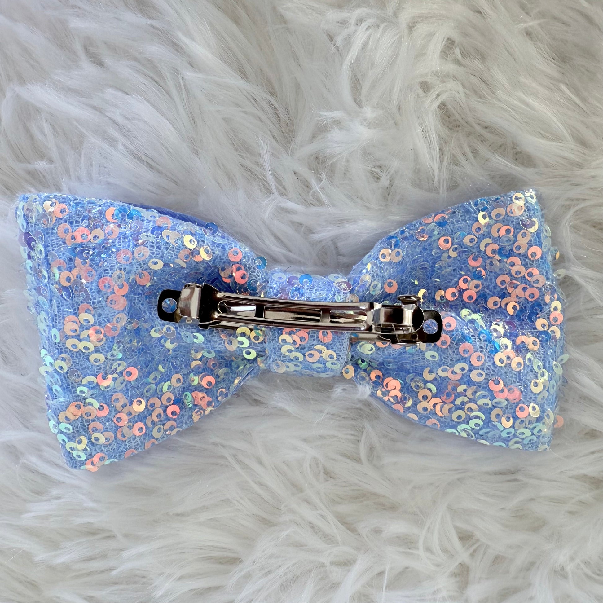 Inspired by the beloved Snow Queen, this medium-sized bow sparkles with shimmering sequins in cool shades of icy blue and silver.